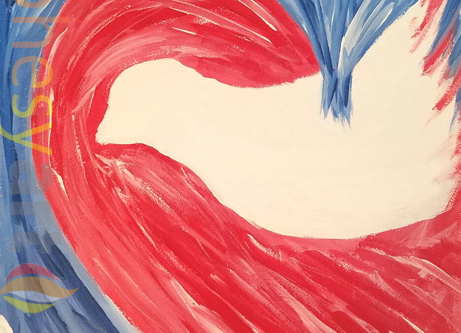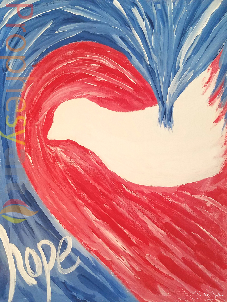 Hope is a painting based on Romans 5. The heart represents the hearts of believers receiving God’s love, which is being poured out by the Holy Spirit (the dove). “Hope does not disappoint us, because God has poured out his love into our hearts by the Holy Spirit, whom he has given us” (Romans 5:5).